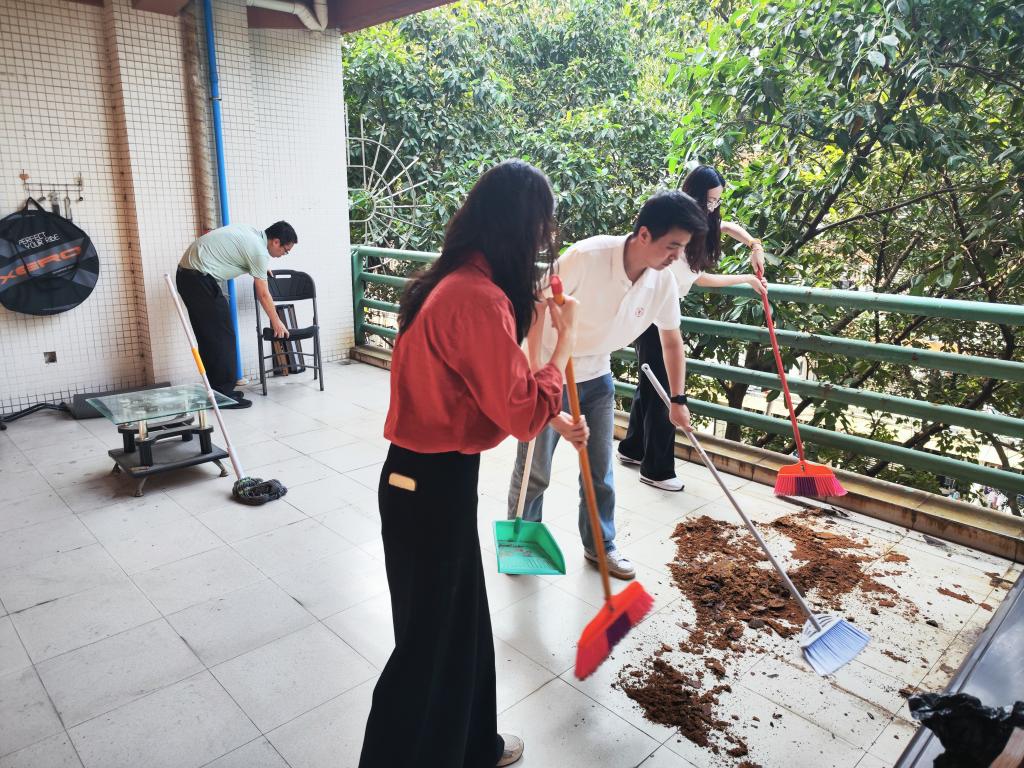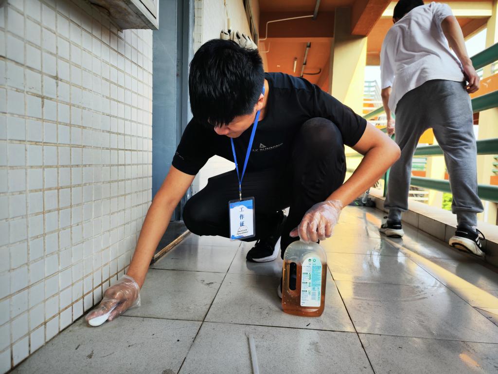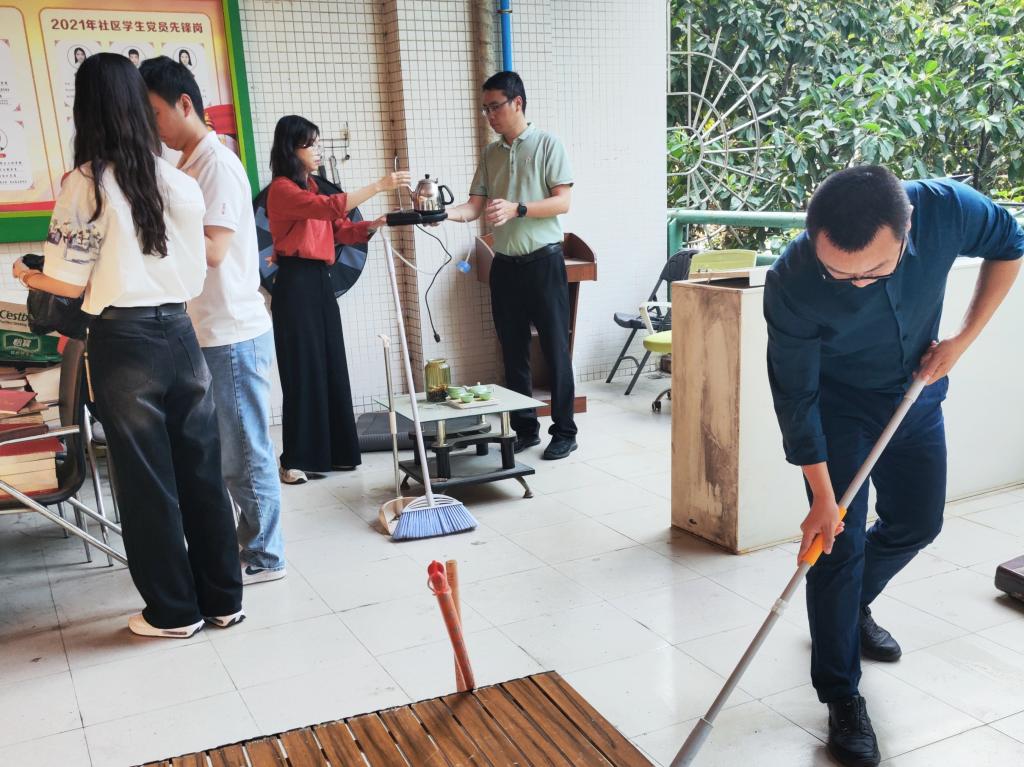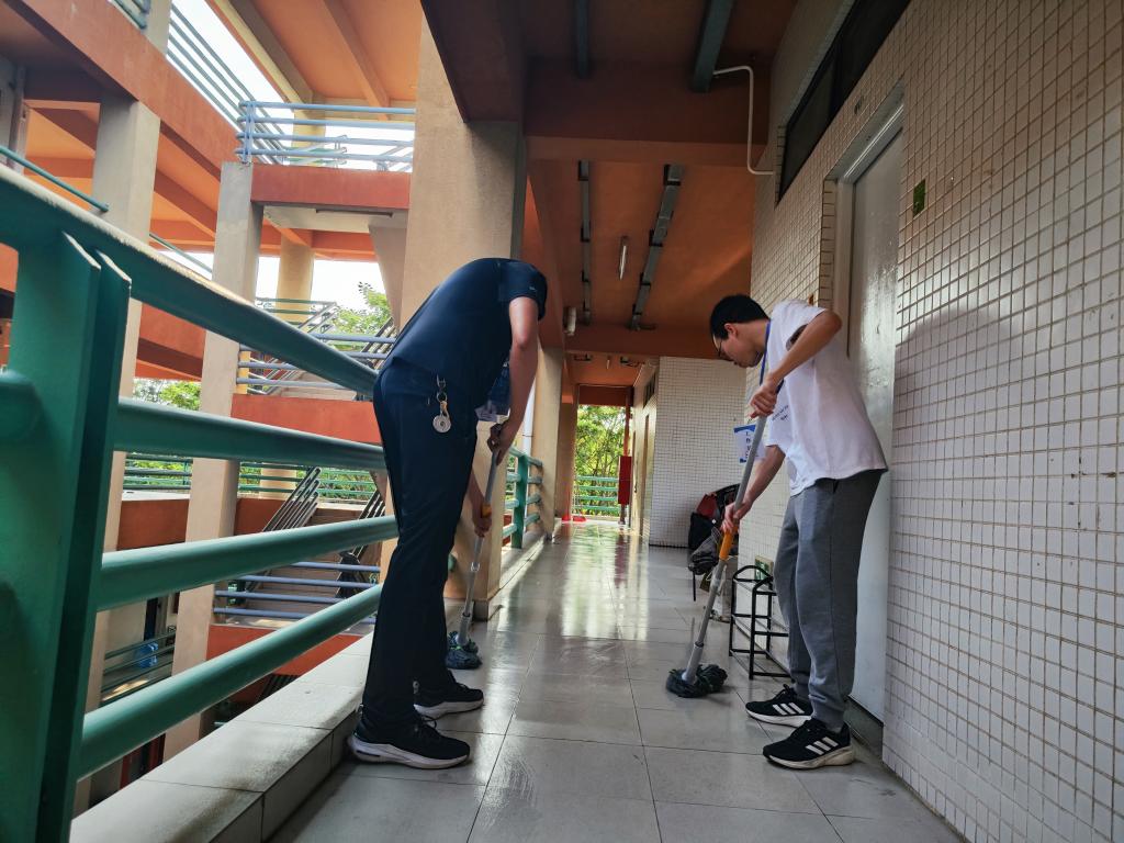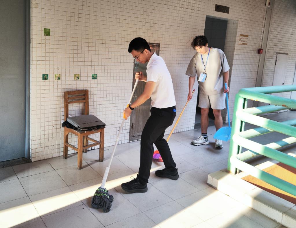 学院全体学工队伍以“躬身力行”为初衷,扎扎实实动手干,对社区平台、走廊等公共区域展开全面清洁。从清扫地面污渍到擦拭公共设施,从整理杂物到排查卫生死角,师生们同心协力,以劳动传递责任担当。谭敬康老师在活动中表示:“劳动教育是培养德智体美劳全面发展人才的重要环节,师生同劳动不仅能增进情感,更能以示范作用引导学生树立正确的劳动价值观。”